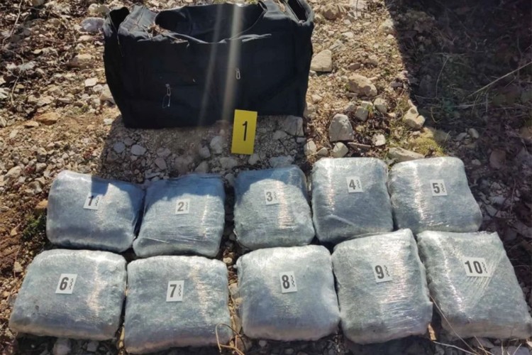 Pripadnici Granične policije BiH su prilikom nadzora granice i pretrage terena pronašli u niskom rastinju odbačenu putnu torbu u kojoj je bilo deset pakovanja, ukupno 10, 595 kilograma marihuane.