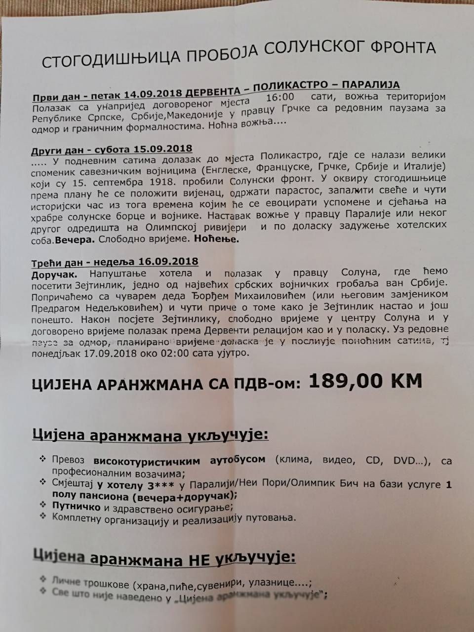 Cijena aranžmana, koji uključuje putovanje visokoturističkim autobusom i smještajem u vidu polu-pansiona u hotelu sa tri zvjezdice, iznosi 189 maraka. Sve informacije zainteresovani mogu dobiti i na telefon 065 540 162, pipe Derventa Cafe.