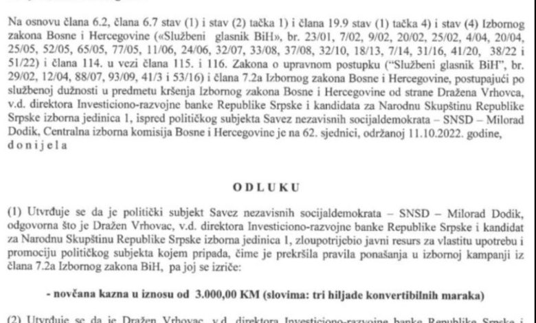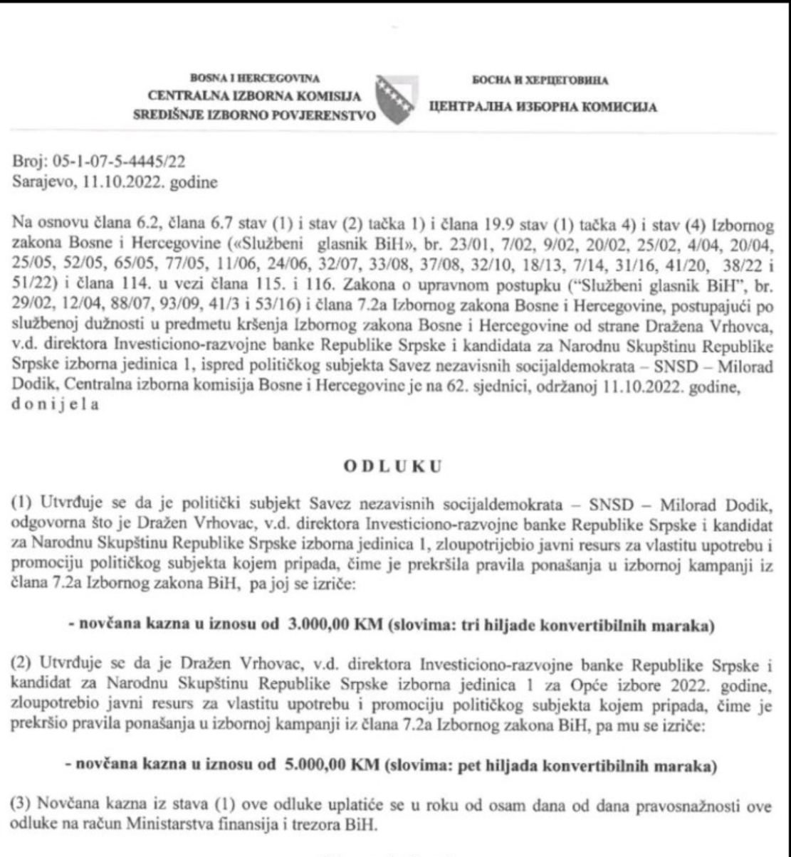 U Odluci CIK piše da je Vrhovac zloupoteijebio javni resurs za vlastitu upotrebu i promociju političkog subjekta kome pripada, čime su prekršena pravila ponašanja u izbornoj kampanji iz člana 7.2.a Izbornog zakona BiH.