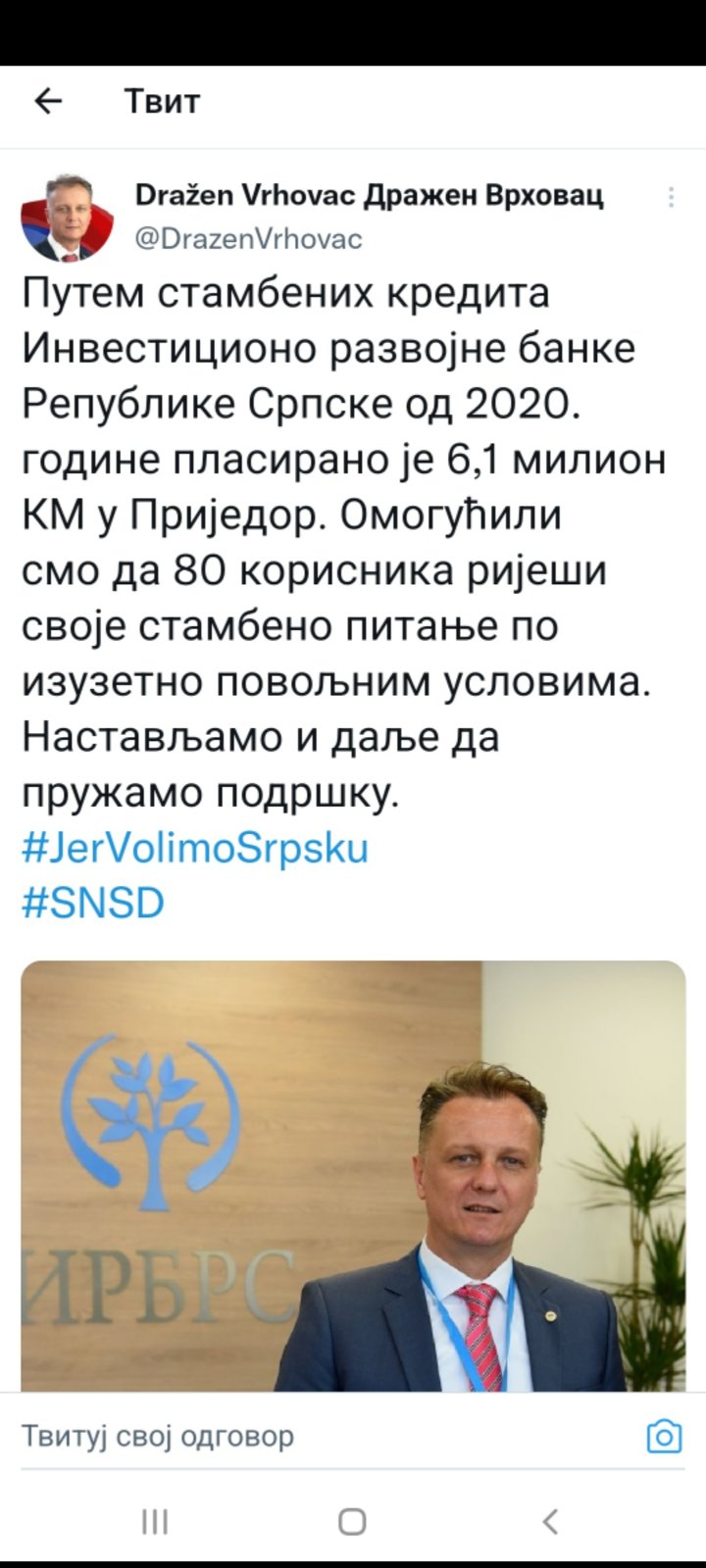 Priložen je dokaz – tvit Vrhovca koji u kampanji promoviše stambene kredite IRB RS, sve uz slogan SNSD “Jer volimo Srpsku”.