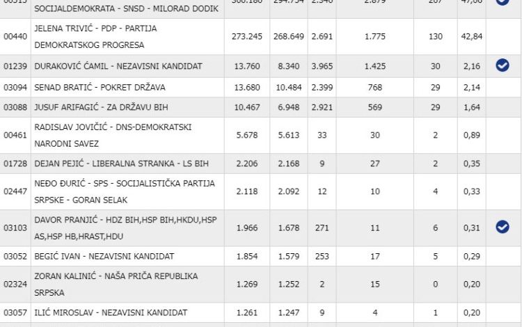 Prema tim rezultatima, Milorad Dodik, kandidat SNSD-a, osvojio je 300.180 glasova (47,06 odsto), dok je Jelena Trivić, kandidat PDP-a, osvojila 273.245 glasova (42,84 odsto).