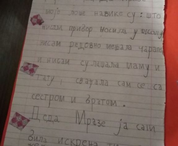 “Dragi Deda Mraze, moje loše navike su: što nisam pribor nosila u školu, nisam redovno menjala čarape i nisam slušala mamu i tatu, svađala sam se sa sestrom i bratom. Deda mraze ja sam bila iskrena, ti odluči. Želim Lego set. Milica”, poručila je ona u pismu bradonji sa sjevera Europe.