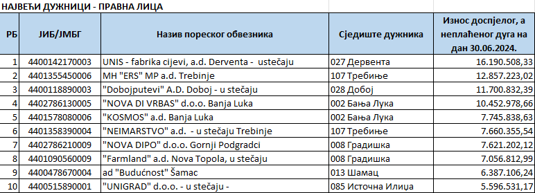 Prema najnovijem spisku Poreske uprave RS na kraju juna najveći poreski dužnik bila je Fabrika cijevi Unis u stečaju iz Dervente sa 16,2 miliona KM, a odmah iza njih našlo se Matično preduzeće ERS koje samo mjesec ranije, na kraju maja, nije bilo  na spisku najvećih dužnika.