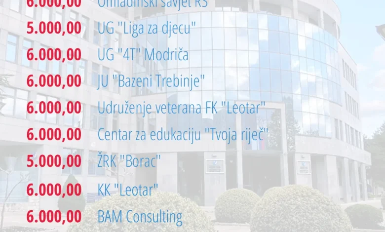 Među dobavljačima ovih usluga našli su se udruženje korisnika voda za navodnjavanje ” VUČIJA”, Omladinska organizacija “DELTA”, Organizacija kreativnog okupljanja Nevesinje, Institut za srpsku kulturu iz Nikšića, omladinska organizacija “Mreža mladih”, Udruženje “Pozitiva” itd.