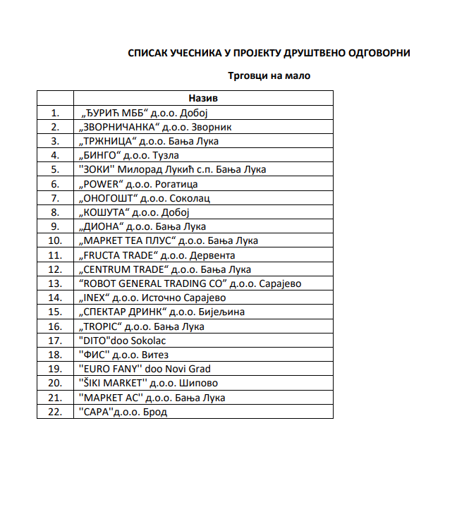 – Kampanja „Društveno odgovorni” predstavlja kontinuiranu kampanju i aktivnost Ministarstva trgovine i turizma Republike Srpske i pozivamo zainteresovane proizvođače, distributere i trgovce koji se do sada nisu uključili u kampanju da to učine. Po ažuriranju lista učesnika i proizvoda obuhvaćenih kampanjom, javnost će biti blagovremeno informisana – saopšteno je iz ministarstva.