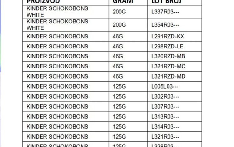 Ferero je kao mjeru opreza odlučio dobrovoljno da povuče iz prodaje u BiH proizvod Kinder škobons sa sljedećim lot brojevima, proizveden u Belgiji: