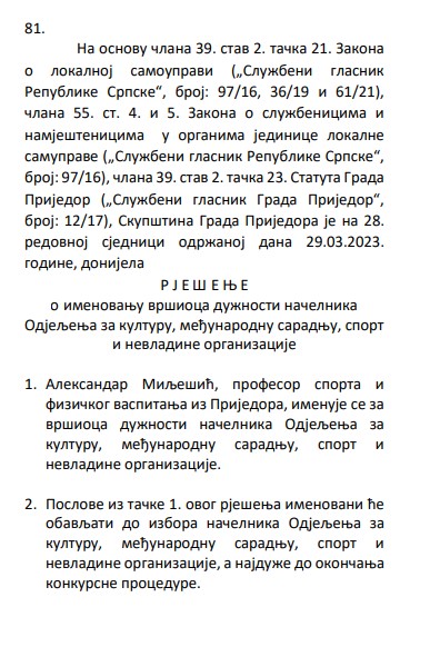 Međutim, krajem marta ove godine Skupština grada Prijedora izabrala ga je za vršioca dužnosti načelnika Odjeljenja za kulturu, međunarodnu saradnju, sport i nevladine organizacije.