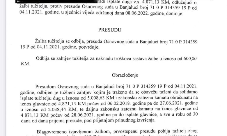 Njegove tvrdnje potkrepljuje i presuda Okružnog suda u Banjaluci koji je odbio tužbeni zahtjev u kojem je UniCredit banka Banjaluka u dva navrata pokušala od nasljednika da naplati 5.000 maraka, ono što je bila dužna da traži od Croatia osiguranja koji je izdao polisu za osiguranje kredita. Utvrđeno je da, s obzirom na to da je postojalo životno osiguranje, ne postoji odgovornost nasljednika.