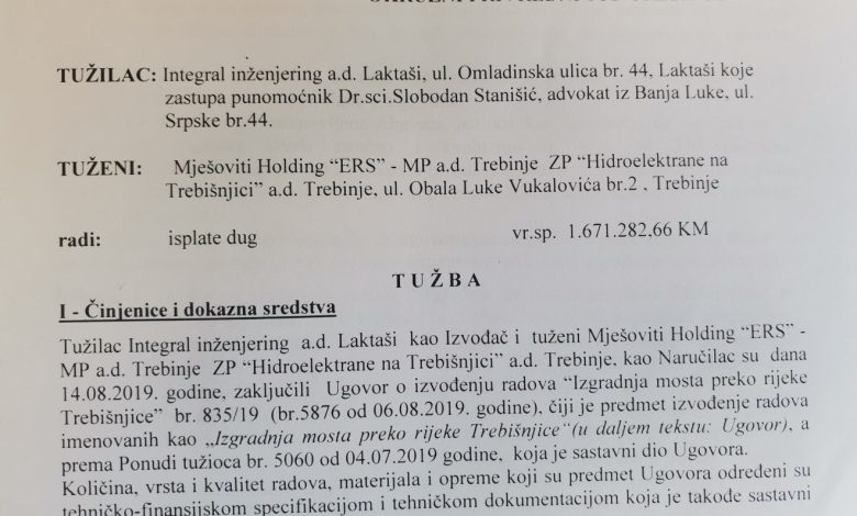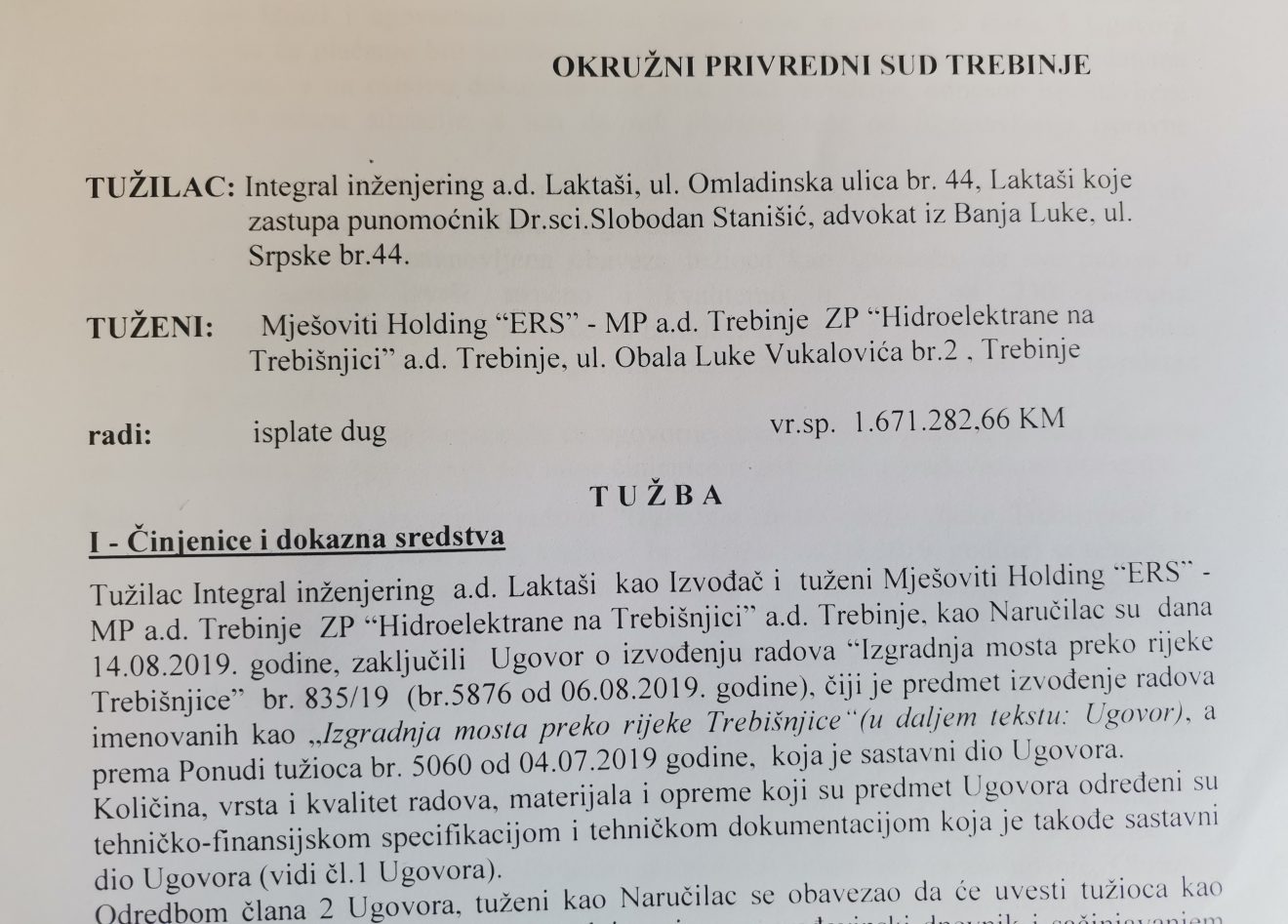 Kompanija „Integral inženjering“ podnijela je tužbu protiv „Hidroelektrana na Trebišnjici“ (HET) kojom od ovog zavisnog preduzeća iz holdinga „Elektroprivreda RS“ potražuje 1.671.000 KM za projekat „Izgradnja mosta preko rijeke Trebišnjice“, otkriva CAPITAL.