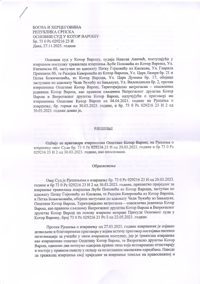 Nakon što je Okružni sud u Banjoj Luci ukinuo ranije rješenje kotorvaroškog Osnovnog suda i vratio predmet na ponovni postupak, ovaj sud je presudio u korist otpuštenih vatrogasaca Petka Božičkovića, Radojka Keverovića i Ljube Popovića.