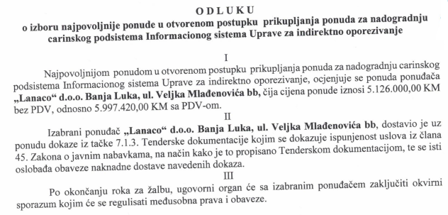 – Najpovoljnijom ponudom u otvorenom postupku prikupljanja ponuda za nadogradnju carinskog podsistema informacionog sistema UIO, ocjenjuje se ponuda ponuđača „Lanaco“ čija cijena iznosi 5,12 miliona KM bez PDV-a, odnosno 5,99 miliona KM sa PDV-om – navedeno je u odluci UIO.