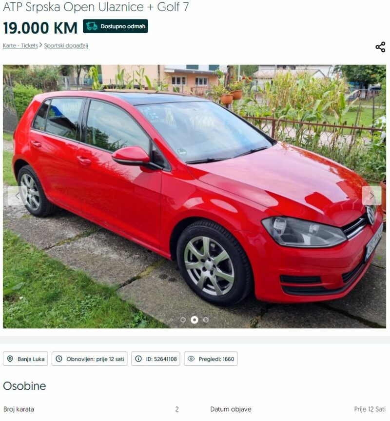 – Želite da gledate najboljeg tenisera u istoriji, a da na turnir dođete Golfom 7 koji ima panorama krov?Na prodaju 2 karte za treći dan turnira Srpska open. Uz kupovinu karata na poklon dobijate vozilo “folkswagen golf 7”, 1.6, 77kw, 2013 godina.Auto uvezeno iz Njemačke prije tri godine, redovno održavano u ovlaštenom servisu, odrađen veliki i mali servis. Posjeduje servisnu knjigu i dva ključa.Originalna kilometraža što se može provjeriti u ovlaštenom servisu gdje je i servisiran.Auto bez ikakvih dodatnih ulaganja.Posjeduje i panorama krov, zeder, zimske gume kupljenje nove početkom prošle sezone (Michelin) i ljetne gume na alu felgama.Tek registrovan – piše u oglasu.