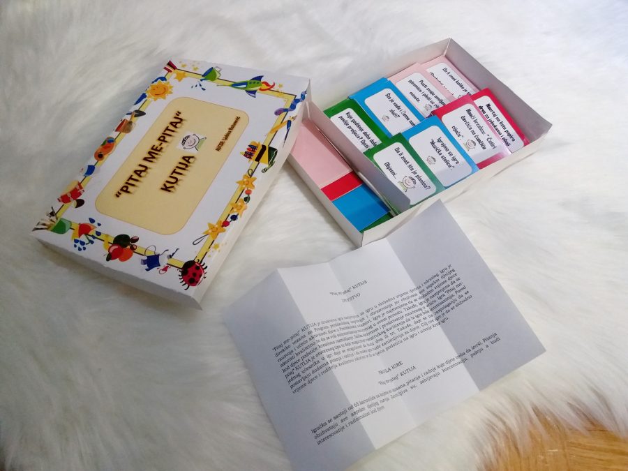 – Moj treći rad je moja didaktička igračka “Pitaj me-pitaj“ КUTIJA. To je društvena igra koja je namijenjena za razvoj dječije pažnje, koncentracije i razvoj govora. Prati programske aktivnosti u vrtiću, a namijenjen je evaluaciji kroz igru u slobodno vrijeme. Ustvari, igra je namijenjena da se kvalitetno iskoristi slobodno vrijeme roditelja i djece – objasnila je ona.