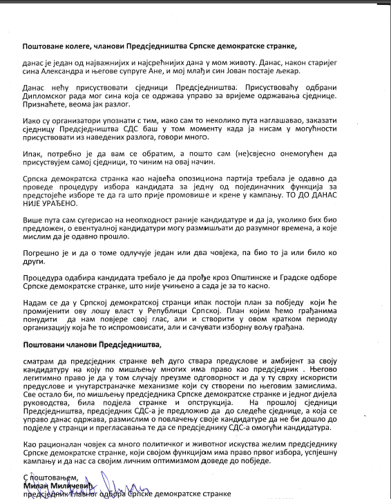– Smatram da predsjednik stranke već dugo stvara preduslove i ambijent za svoju kandidaturu na koju po mišljenju mnogih ima pravo kao predsjednik. Na prošloj sjednici Predsjedništva, predsjednik SDS-a je predložio da do sljedeće sjednice, a koja se upravo danas održava, razmislim o povlačenju svoje kandidature da ne bi došlo do podjele u stranci i preglasavanja te da se predsjedniku SDS-a omogući kandidatura. Kao racionalan čovjek sa mnogo političkog i životnog iskustva želim predsjedniku Srpske demokratske stranke, koji svojom funkcijom ima pravo prvog izbora, uspješnu kampanju i da nas sa svojim ličnim optimizmom dovede do pobjede – naveo je Miličević u pismu.