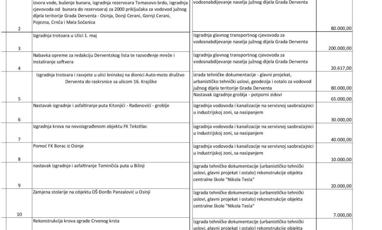 Među "krupnijim" projektima je i izgradnja trotoara u Ulici 1. maja koja će koštati 200.000 KM. Za izgradnju trotoara i rasvjete u Kninskoj ulici biće potrošeno 145.000 KM. Prva faza izgradnje video nadzora u Derventi koštaće 60.000 maraka.