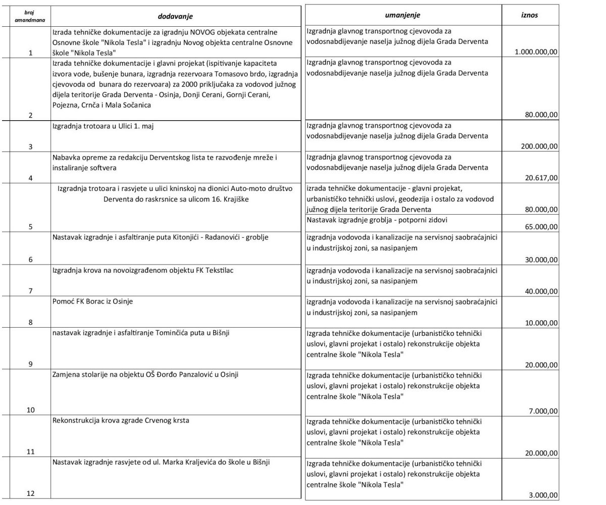 Odbornici Skupštine Grada Derventa usvojili su izmijenjeni Prijedlog raspodjele ostvarenog suficita i namjenskih sredstava s obzirom na to da je na prvobitni prijedlog gradonačelnika Milorada Simića usvojeno 18 amandmana skupštinske većine. Od prvobitnog prijedloga ostala su sredstva za finansiranje prve faze video-nadzora i uređenje oborinskih voda u "Kineskoj četvrti".