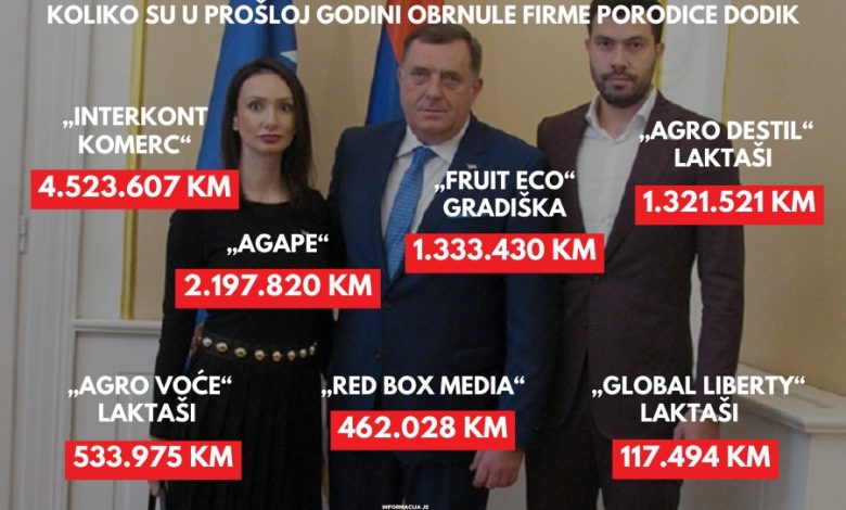 Firme u vlasništvu porodice predsjednika Republike Srpske Milorada Dodika su prošle godine obrnule oko deset miliona maraka, a sudeći prema finansijskim izvještajima najbolje je poslovao „Agro destil“ u vlasništvu Dodikovog zeta Pavla Ćorovića.