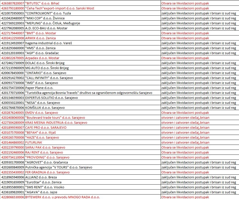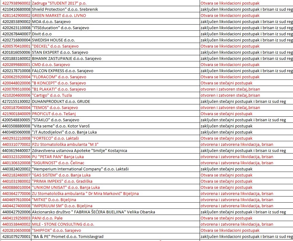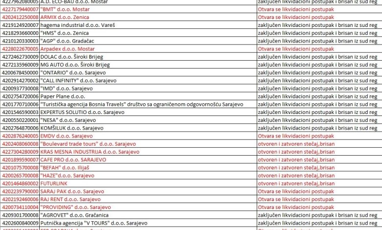 Likvidacioni postupak je pokrenut u firmama “EMDV”, “Providing” i“Fer gradnja” iz Sarajeva, “Luna” iz Tomislavgrada, “AMDS” iz Gradačca.