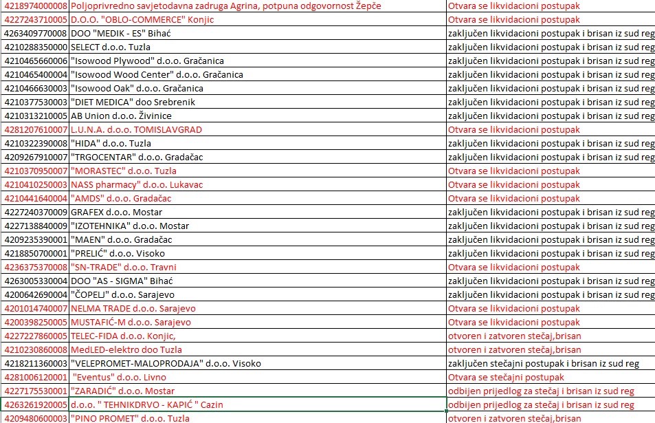 Tako su u stečaj otišli “B koncept“ iz Sarajeva, “Forteco” iz Laktaša, “Gas sistem” i “Unikom sat” iz Banjaluke, “Prima impeks” iz Gradiške “Pino promet” iz Tuzle i brojni drugi.