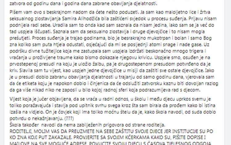 Ova vijest je uznemirila i Eminu Brkanić koja je, kako prenosi pomenuti medij, prije sedam godina bila učenica OŠ Grbavica 1 u Sarajevu i žrtva pedofila-nastavnika Samira Alihodžića.