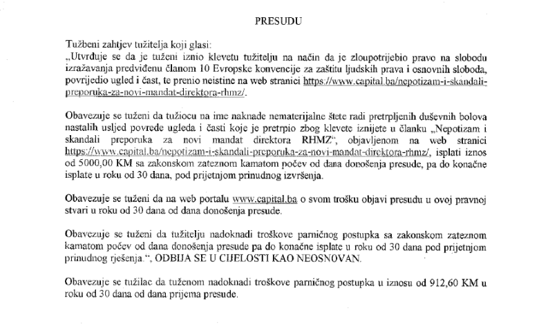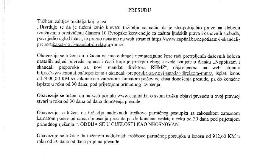 “Navodi u spornom tekstu u suštini predstavljaju istinito i razumno izražavanje s obzirom na to da je tužitelj (Borojević) nakon objave spornog teksta imenovan na funkciju direktora Zavoda, da je osvojio maksimalnih 50 bodova na intervjuu, da je za vrijeme njegovog mandata vršioca dužnosti direktora njegova supruga napredovala imenovanjem na višu poziciju, te da je za vrijeme mandata tužitelja kao v.d. direktora došlo do kršenja Zakona o javnim službenicima jer je Zavod 2021. godine zaposlio 18 radnika na određeno vrijeme bez sprovođenja javnog konkursa“, navodi se u presudi.