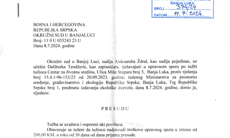 Međutim, kako se jasno vidi u presudi, ministarstvo je pobilo svoj zaključak i donijelo ekološku dozvolu.