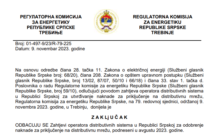 U komisiji su smatrali da je ovaj sistem od značaja za sve potrošače i proizvođače struje u Srpskoj te da zbog toga svi zajedno treba da snose troškove, a ne samo novi korisnik.