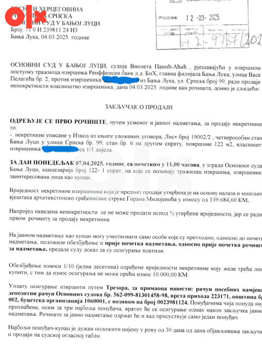 Osnovni sud u Banjaluci zakazao je za naredni ponedjeljak prodaju stana od 122 kvadrata u centru grada.