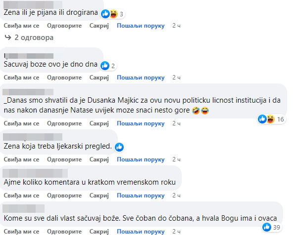 "Dobro je nama ko nas predstavlja. Pametan čovjek nema šta dodati, to je dno dna; Daj čovjeku vlast pa ćeš da vidiš kakav je, stara narodna izreka; Žena je ili pijana ili drogirana; Strašno kakav riječnik ima; Gdje ih sabraše ovako pismene”, samo su neki od komentara građana.