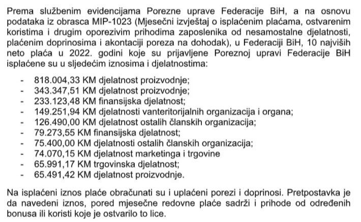 – Na isplaćeni iznos plate obračunati su i uplaćeni porezi i doprinosi. Pretpostavka je da navedeni iznosi, pored mjesečne redovne plate sadrže i prihode od određenih bonusa ili koristi koje je ostvarilo to lice – kazali su u Poreznoj upravi FBiH.