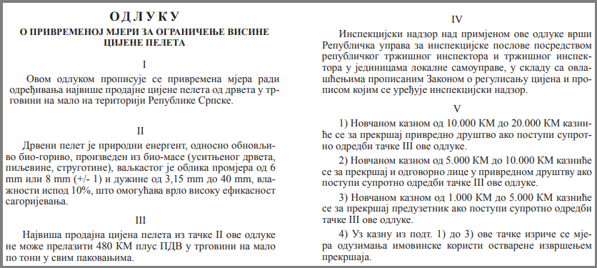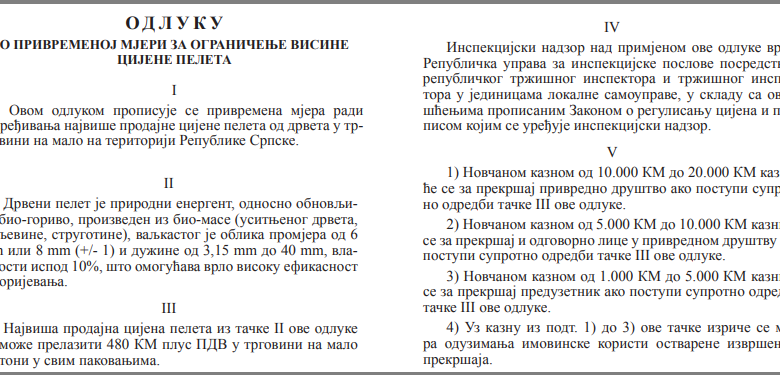– Najviša prodajna cijena peleta ne može prelaziti 480 КM plus PDV u trgovini na malo po toni u svim pakovanjima. Inspekcijski nadzor nad primjenom ove odluke vrši Republička uprava za inspekcijske poslove posredstvom republičkog tržišnog inspektora i tržišnog inspektora u jedinicama lokalne samouprave – navedeno je u odluci.