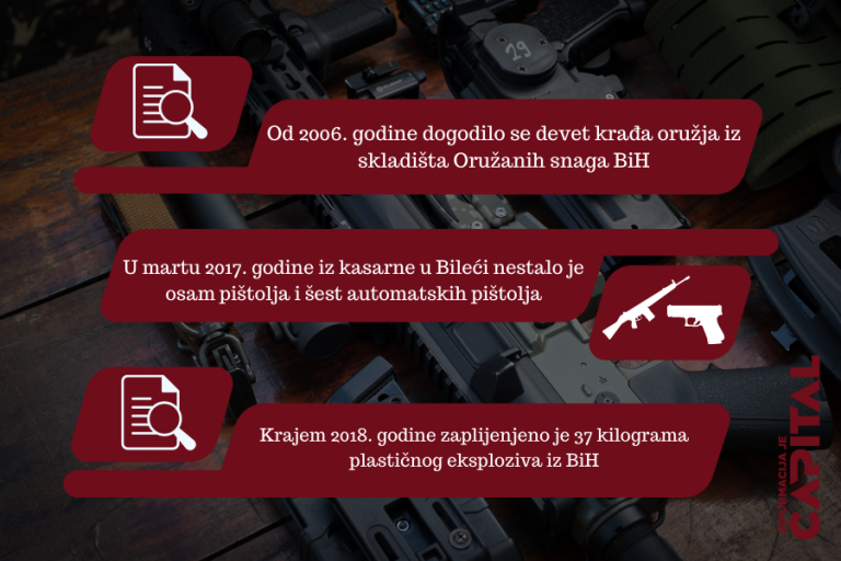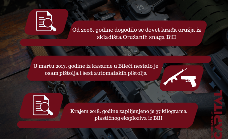 Od 2006. godine dogodilo se devet krađa oružja iz skladišta Oružanih snaga BiH. U martu 2017. godine iz kasarne u Bileći nestalo je osam pištolja i šest automatskih pištolja. Oružje i municiju ukrao je vojnik u kasarni na Palama 2018. godine. Ministarstvo odbrane je u februaru 2021. godine obavijestilo da je nestala “određena količina oružja iz Centra za osnovnu obuku u Pazariću“, a navodno je ukradeno 25 visokokvalitetnih pištolja.