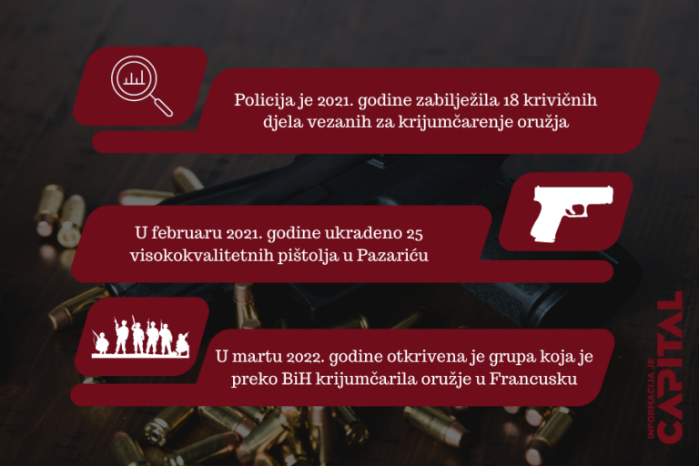 Prema informacijama Granične policije BiH, jedan broj nedavnih zapljena ukazuje na krijumčarenje vatrenog oružja. Policija je 2021. godine zabilježila 18 krivičnih djela vezanih za krijumčarenje oružja. Zaplijenjeno je 27 komada oružja, bombi i 1.135 komada municije.