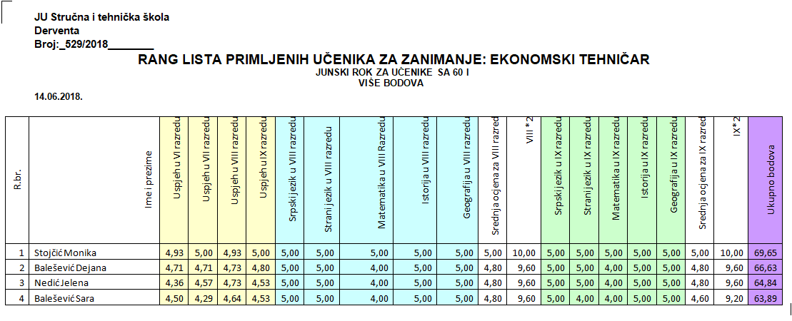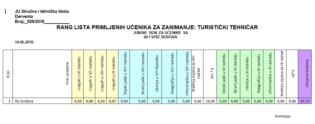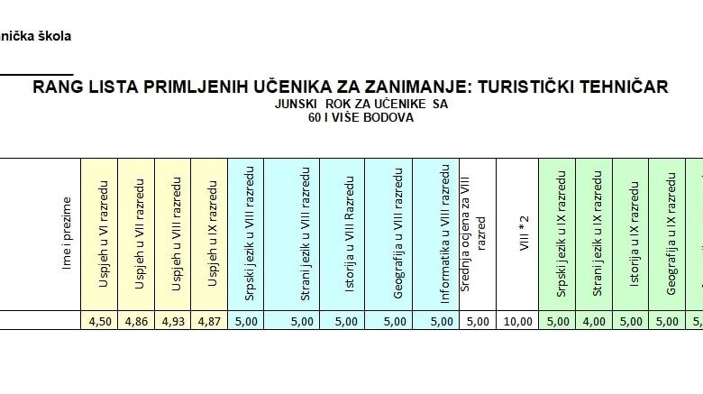 Donosimo rang liste učenika sa više od 60 bodova primljenih na zanimanja ekonomski i turistički tehničar, te tehničar za CNC tehnologije.