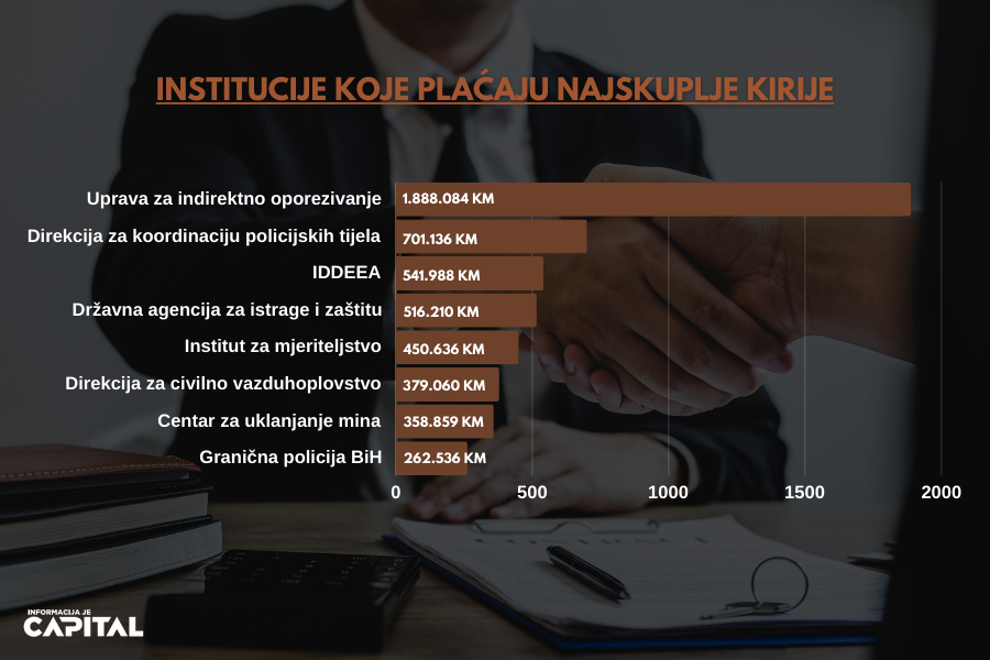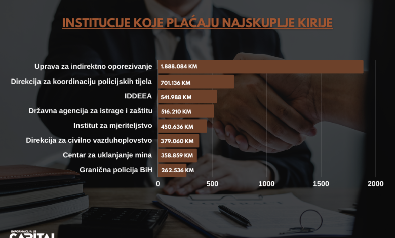 Prema podacima Službe za zajedničke poslove institucija BiH, rekorder po ukupnom izdvajanju je Uprava za indirektno oporezivanje koja godišnje za kiriju daje nepunih 1,9 milion KM, a poslije UIO najviše sredstava za smještaj izdvaja Direkcija za koordinaciju policijskih tijela – 701.136 KM godišnje, te Državna agencija za istrage i zaštitu (SIPA) koja za kiriju godišnje plaća 516.210 KM.