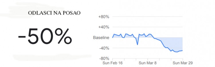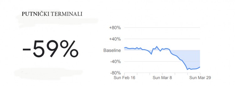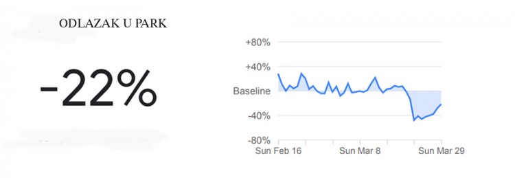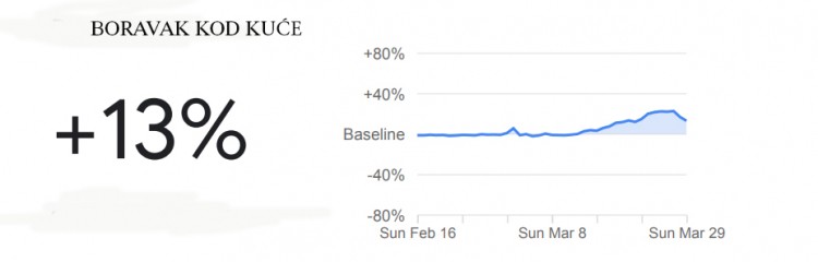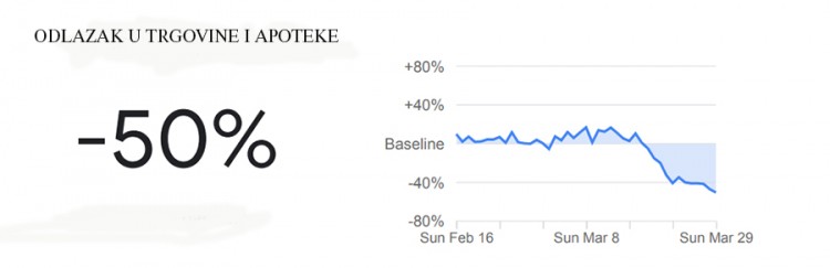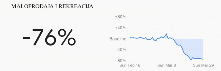 Što se tiče BiH, u periodu od 16. februara do 29. marta posjeta buticima i mjestima za razonodu pala je za 76 odsto, trgovinama, supermarketima, tržnicama i apotekama za 50 odsto, parkovima za 22 odsto, putničkim terminalima za 59 odsto i radnima mjetima za 50 odsto. Istovremeno, boravak o domovima porastao je za 13 odsto.