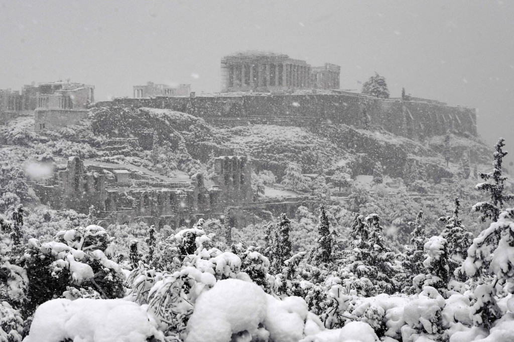 Obilne snežne padavine su rijetke u Atini, ali je grad sada već drugu godinu zaredom pogođen snežnim olujama. Stanovnici Atine imaju jedinstvenu priliku da uživaju u pogledu na Akropolj pod bijelim snježnim prekrivačem. Temperature su se neobično spustile za ovu mediteransku zemlju, pa su u mjestu Nafplio na Peloponezu stabla pomorandži osvanula optočena ledom, kao u filmu "Zaleđeno kraljevstvo".