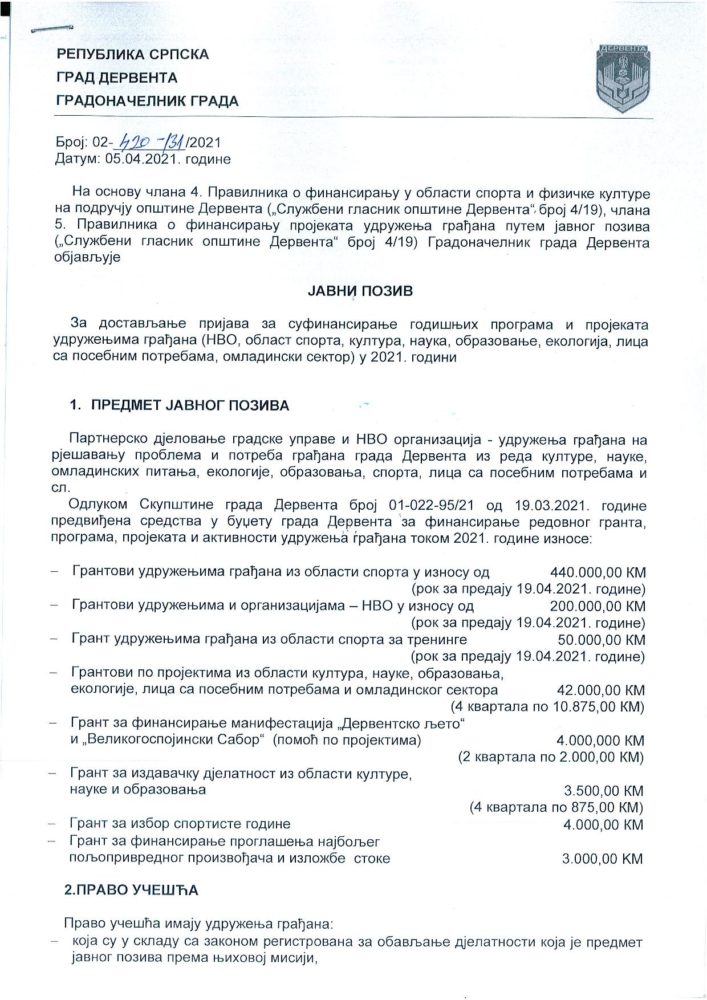 Gradska uprava Derventa raspisala je javne pozive za sufinansiranje programa i projekata udruženja građana, kao i programa javnih preduzeća i ustanova za 2021. godinu.