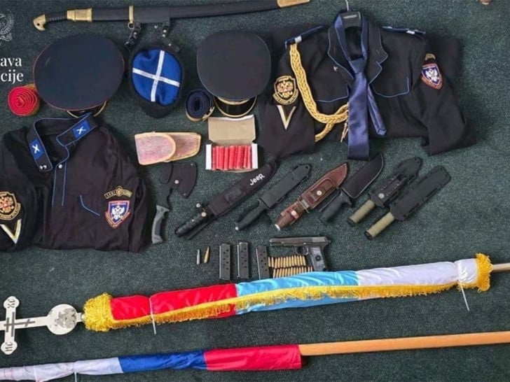 Kod Borislava Jovovića (47) iz Danilovgrada su pretresom pronađene kozačka sablja, kozačka uniforma, više amblema, dva bajoneta, vojna oprema i sredstva komunikacije.
