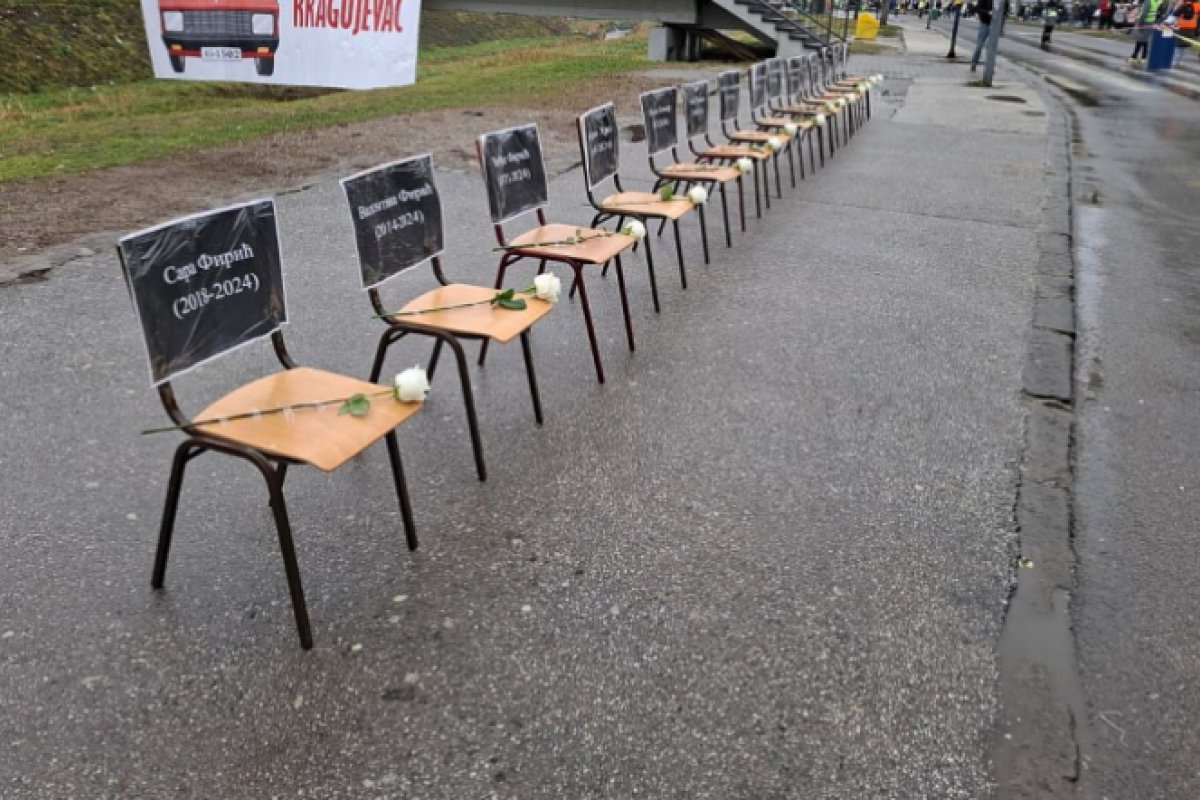 Na Lepeničkom bulevaru u Kragujevcu postavljeno je 15 stolica za stradale u padu nadstrešnice u Novom Sadu, sa bijelim ružama. Građani ostavljaju cvijeće.