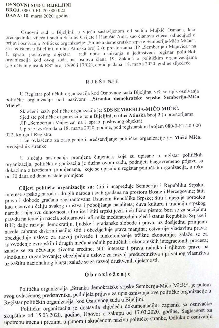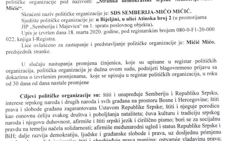 Osnovni sud u Bijeljini donio je 18. marta Rješenje kojim se u Registar političkih organizacija upisuje nova politička organizacija pod nazivom Stranka demokratske Srpske Semberija – Mićo Mićić.