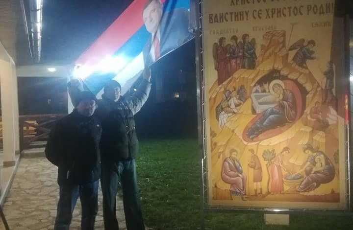 Odmah u blizini crkve, u porti, na svečani bilbord, koji je postavljen u slavu i čast predstojećeg velikog pravoslavnog praznika Hristovog rođenja – Božića neko je zakačio zastavu na kojoj je lik Milorada Dodika.