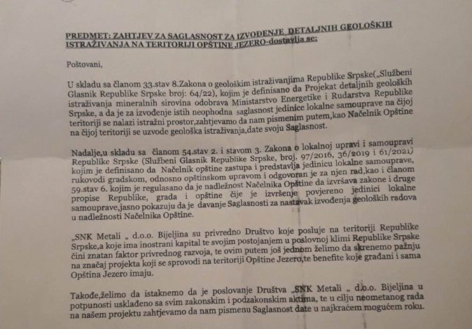 Kompanija “SNK Metali” iz Bijeljine čija su geološka istraživanja prije mjesec jednoglasno zaustavili odbornici Skupštine opštine Jezero, tražila je od načelnice Snežane Ružičić da zanemari volju građana i lično im da dozvolu za nastavak radova.