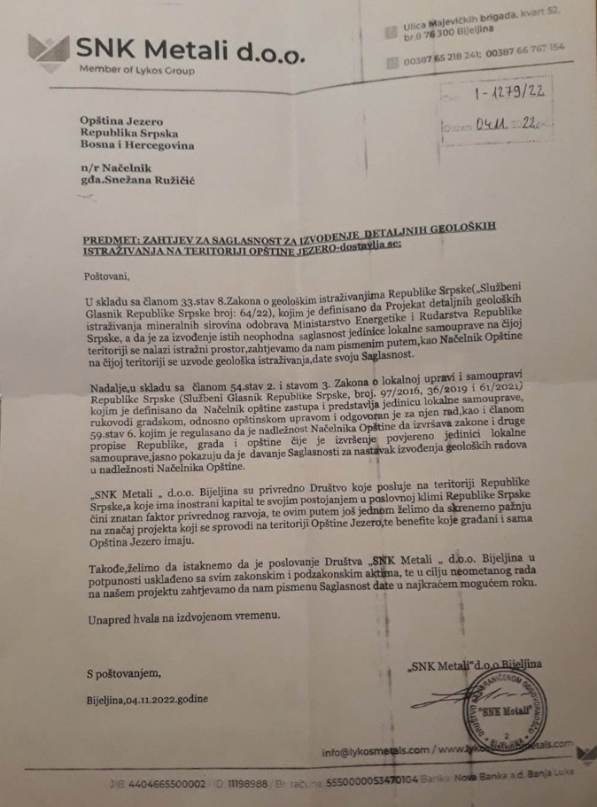 – Za izvođenje radova je neophodna saglasnost jedinice lokalne samouprave na čijoj teritoriji se nalazi istražni prostor. Zahtijevamo da nam pismenim putem, kao načelnik opštine na čijoj teritoriji se izvode geološka istraživanje date svoju saglasnost – navode između ostalog u svom zahtjevu iz “SNK Metala”, inače članica “Lyikos Balkan Metals”.