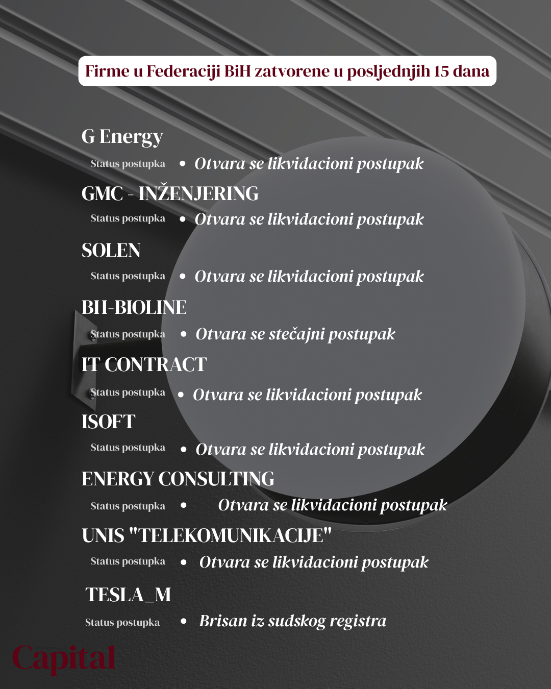 U posljednje dvije sedmice katanac na vrata stavljen je na ravno 56 preduzeća u BiH koje su okončale svoje poslovanje stečajem ili u likvidacionom postupku, piše CAPITAL.ba.