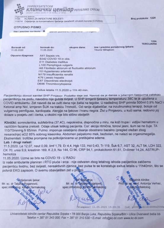 Dana 11. maja kada je pokojnica i preminula, dobio je nalaz sa UKC RS, na kome piše da je uzet bris na COVID-19 sa naznakom – u radu. Među nabrojanim dijagnozama pisao je COVID -19 in obs. a isto to pisalo je i na dopisu koji je Gradsko groblje dobilo od UKC RS.