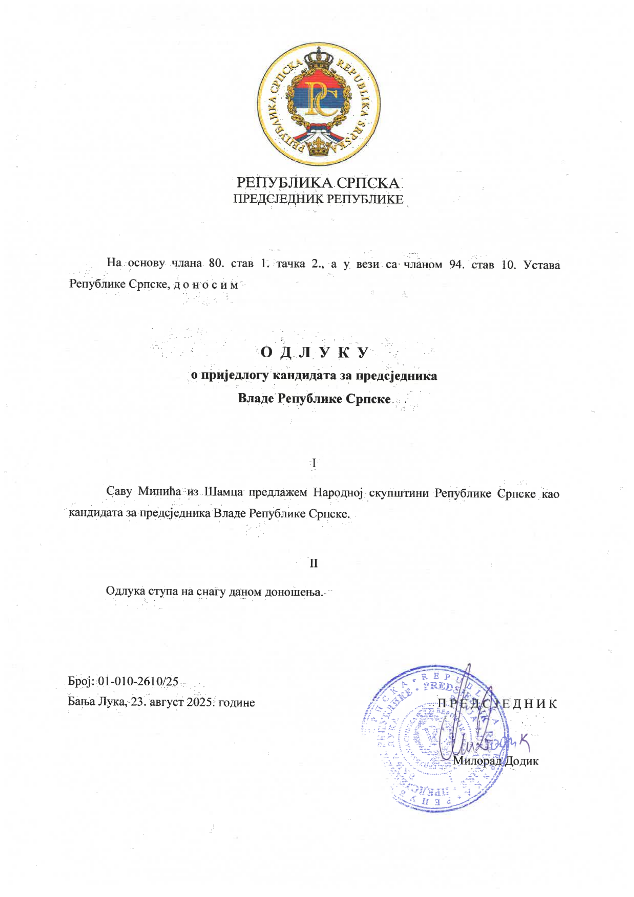 Nenad Stevandić, predsjednik Narodne skupštine Republike Srpske, objavio je dokument na kojem se vidi potpis Milorada Dodika, predsjednika Republike Srpske kojem je Centralna izborna komisija BiH oduzela mandat, o predlaganju Save Minića za predsjednika Vlade Srpske.