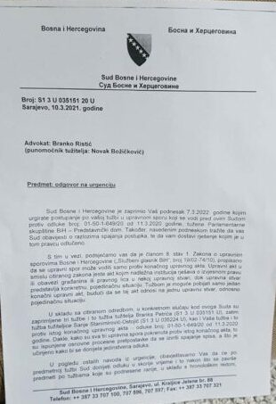 U odgovoru mi je rečeno samo da je moja tužba spojena sa tužbom mog kolege takođe bivšeg člana CIK-a Branka Petrića i tužbom predsjednice Opštinske izborne komisije Vlasenica Sanje Stanimirović-Ostojić, protiv iste odluke Parlamenta BiH od 11. marta 2020. godine – kaže Božičković.