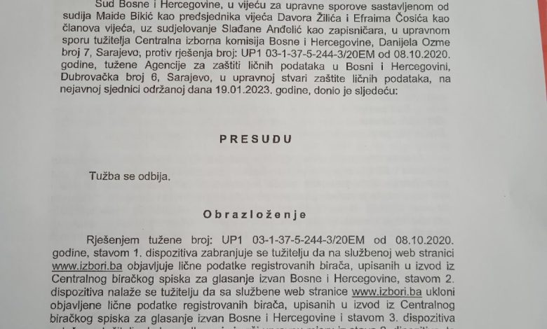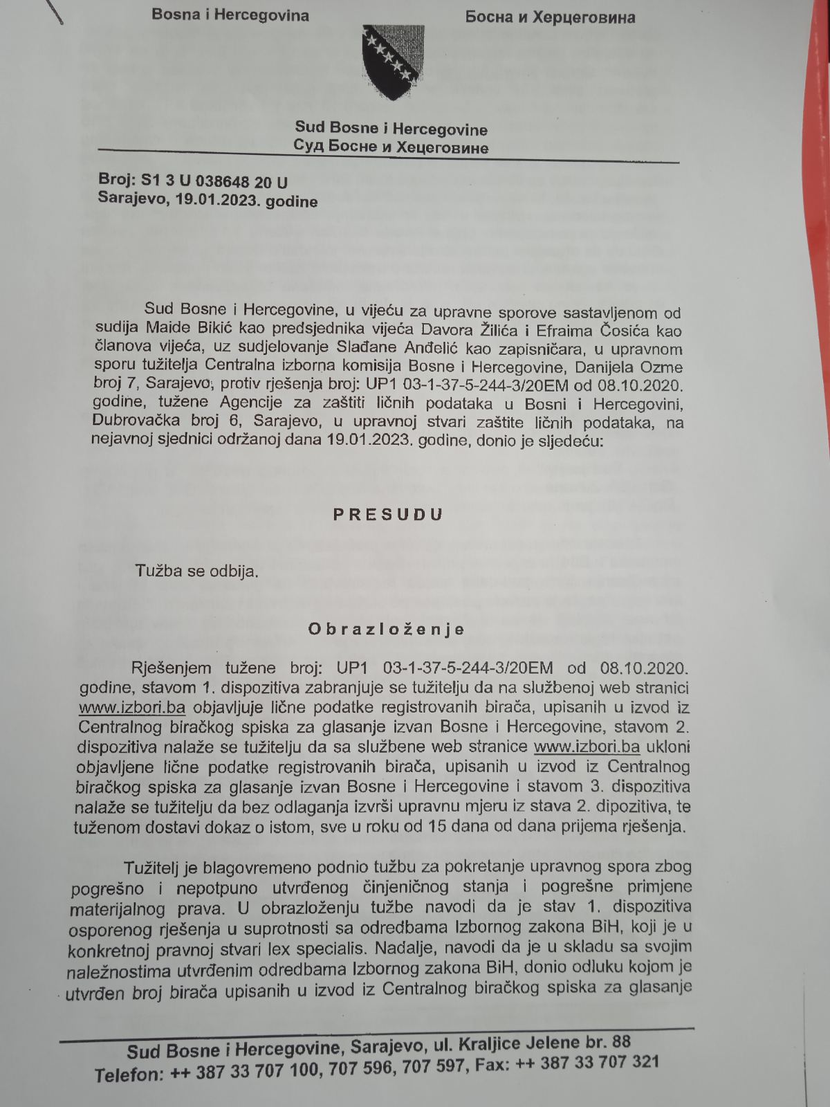 Sud BiH odbacio je tužbu CIK-a i potvrdio rješenje Agencije za zaštitu ličnih podataka BiH kojim je CIK-u zabranjeno da na svojoj veb stranici objavljuje lične podatke birača registrovanih za glasanje izvan BiH.