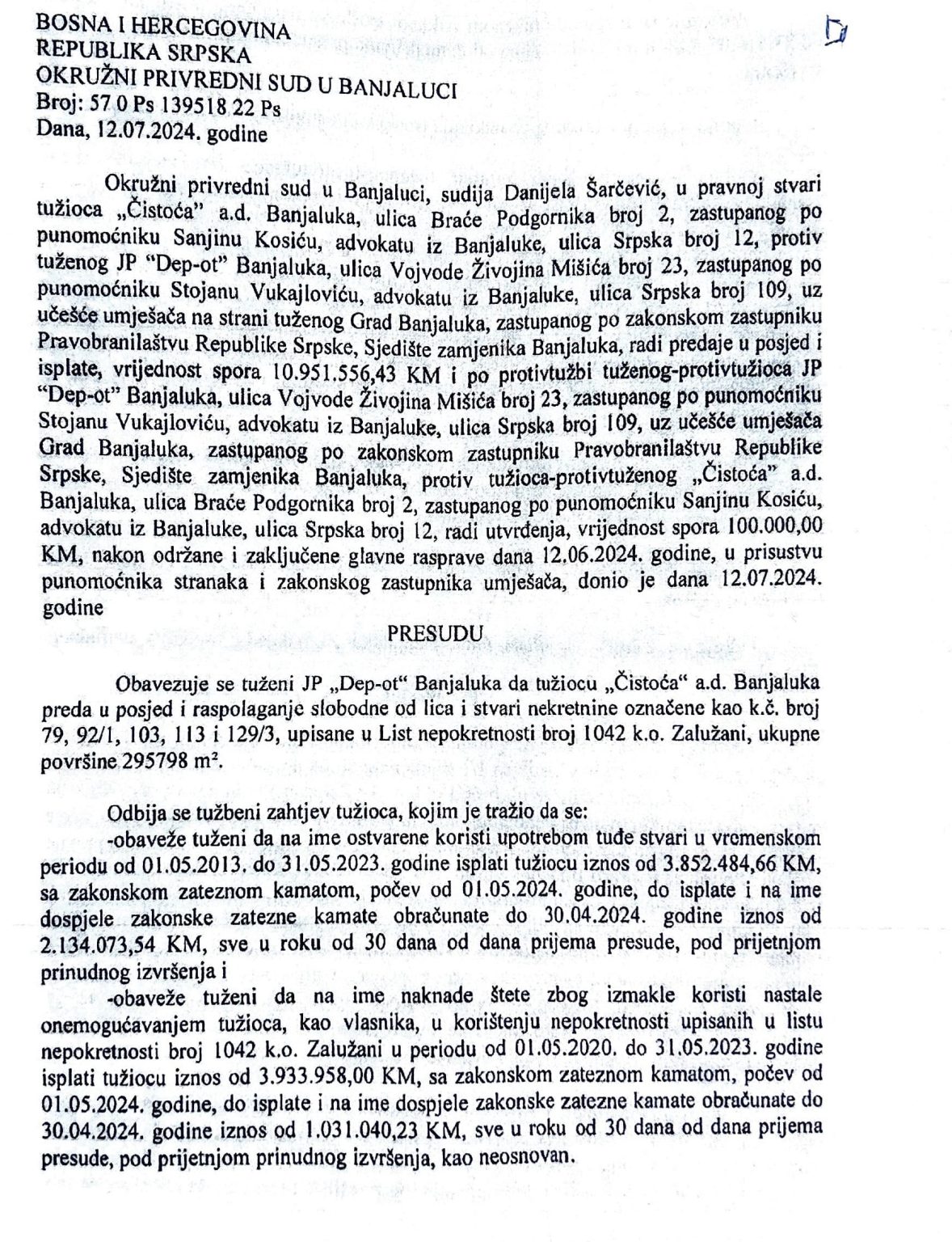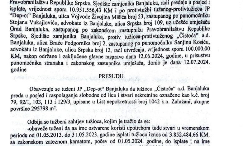 Okružni privredni sud u Banjaluci u petak je donio presudu i obavezao „Depot“ da „Čistoći“ preda u posjed 295 dunuma zemljišta. Sud je istovremeno odbio zahtjev „Čistoće“ da joj „Depot“ na ime ostvarene koristi upotrebom tuđe stvari sa kamatom isplati oko šest miliona KM. Odbijen je i zahtjev za naknadu štete zbog izmakle dobiti od skoro pet miliona KM.